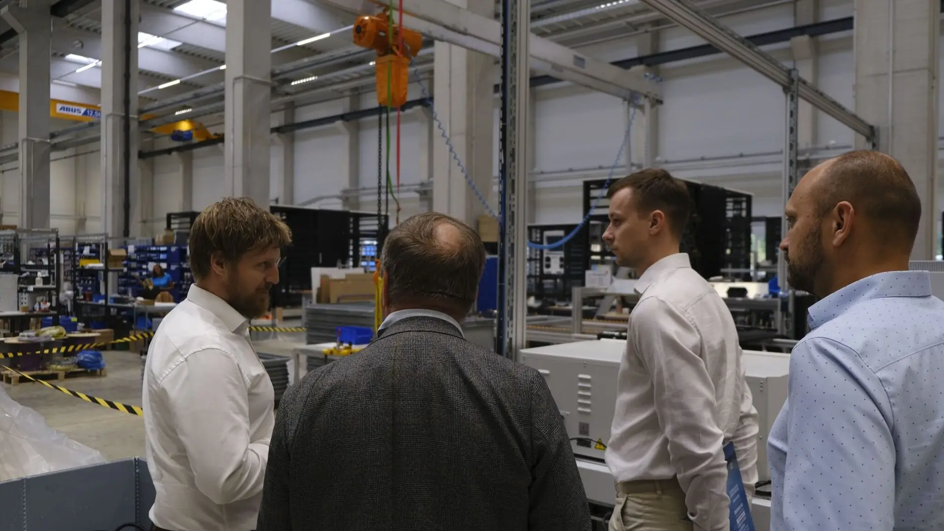 Tour through the production hall Iggensbach – left to right: Leonhard Kriegl (Head of Sales & Customer Support – Residential & Commercial Storage), Vytautas Jokužis, PhD (CEO Elinta), Martynas Vrašinskas (Project Manager and Engineer, Elinta), Tomáš Bílek (Executive Manager – Sales International).