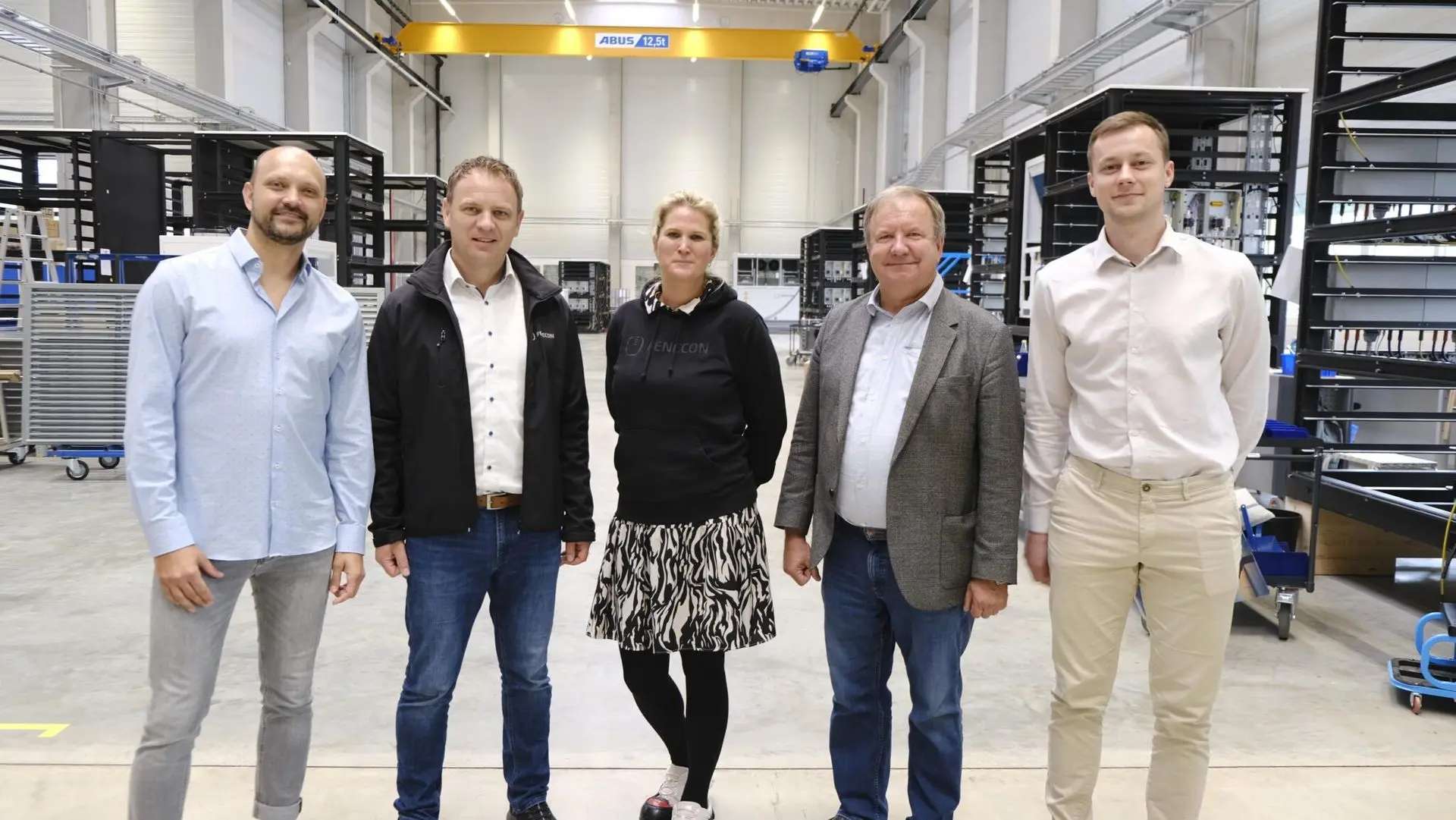 Group photo in the production hall Iggensbach – left to right: Tomáš Bílek (Executive Manager – Sales International), Franz-Josef Feilmeier (CEO), Katerina Bílek (Partner Manager International), Vytautas Jokužis, PhD (CEO Elinta), and Martynas Vrašinskas (Project Manager and Engineer, Elinta).