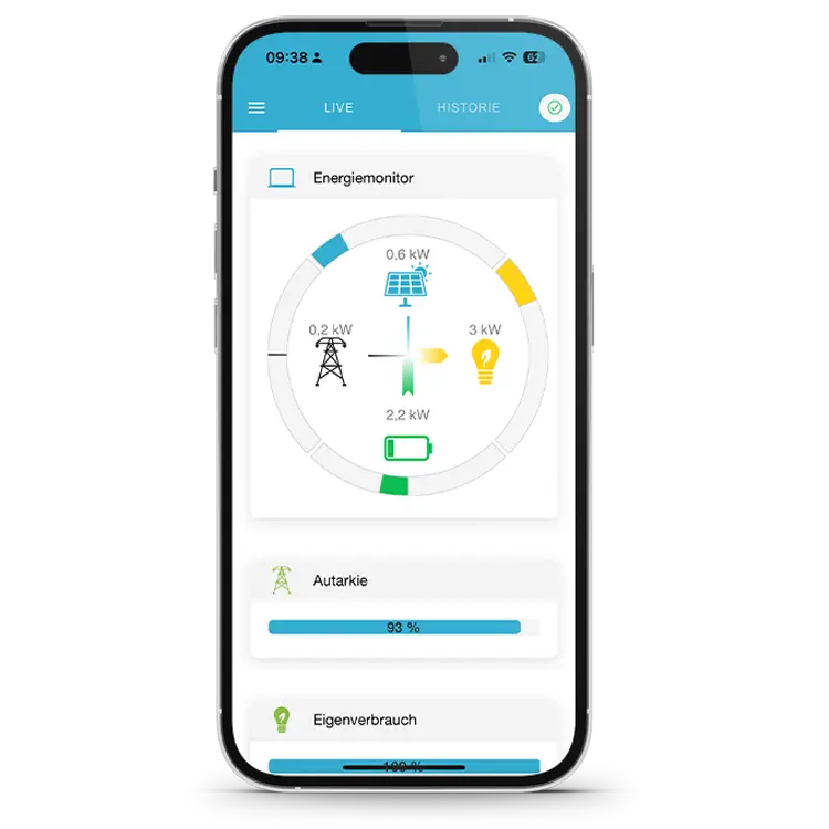 Via online monitoring in your browser or through the app (Android & iOS), you can keep an eye on your energy at any time. Live data, clear analytics, and locally stored history provide full transparency. Your data is always protected through cyber security by design, German-based servers, and a development team located in Germany — naturally in accordance with German data protection and IT security standards.