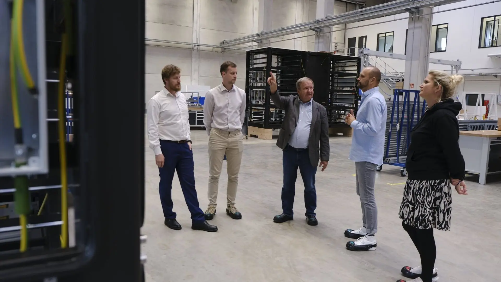 Tolesnė ekskursija po gamybos salę Iggensbach – iš dešinės į kairę: Katerina Bílek (Tarptautinių partnerių vadovė), Tomáš Bílek (Tarptautinių pardavimų vykdomasis vadovas), Vytautas Jokužis, PhD (Elinta generalinis direktorius), Martynas Vrašinskas (Projektų vadovas ir inžinierius, Elinta), Leonhard Kriegl (Pardavimų ir klientų aptarnavimo vadovas – namų ir komercinių energijos kaupimo sistemų sritys).