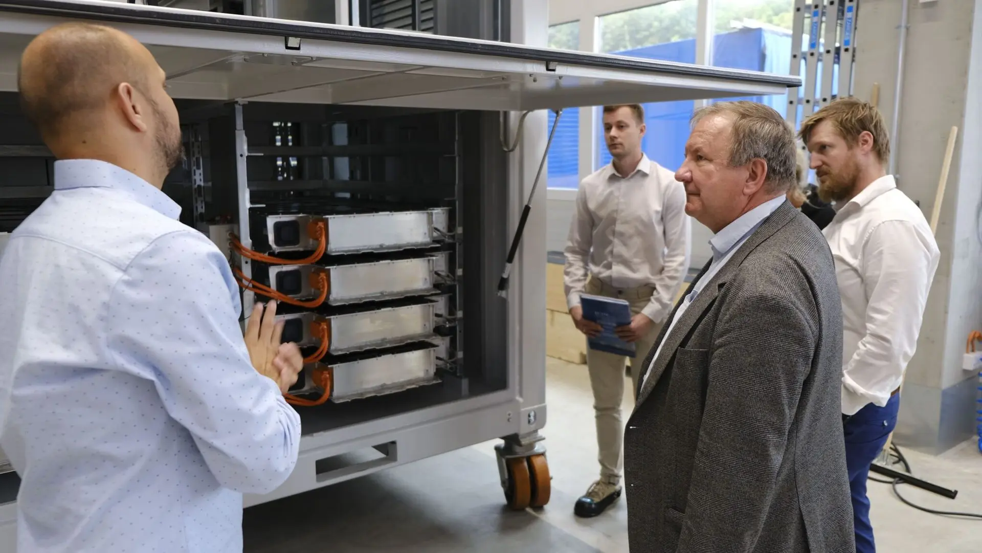 Ekskursija po gamybos salę Iggensbach – iš kairės į dešinę: Leonhard Kriegl (Pardavimų ir klientų aptarnavimo vadovas – namų ir komercinių energijos kaupimo sistemų sritys), Vytautas Jokužis, PhD (Elinta generalinis direktorius), Martynas Vrašinskas (Projektų vadovas ir inžinierius, Elinta), Tomáš Bílek (Tarptautinių pardavimų vykdomasis vadovas).